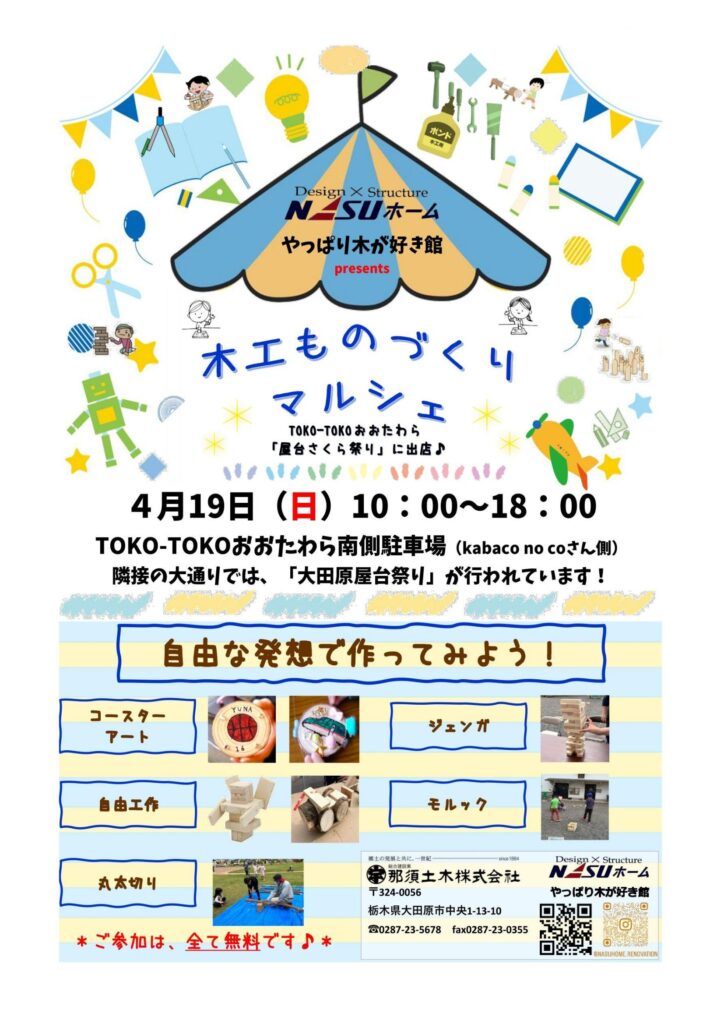 それに併せましてNASUホームでも恒例となりました木工ものづくりマルシェが19日(日)にトコトコ大田原で開催されます。毎年お子様連れには好評を頂いております。