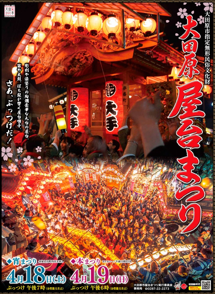 毎年4月の第3土、日曜日に開催されます大田原屋台まつりですが、今年は4月18日(土)宵祭り、4月19日(日)本祭りとなっております。夜のぶっつけは必見ですのでぜひ!一度は足をおはこびください。