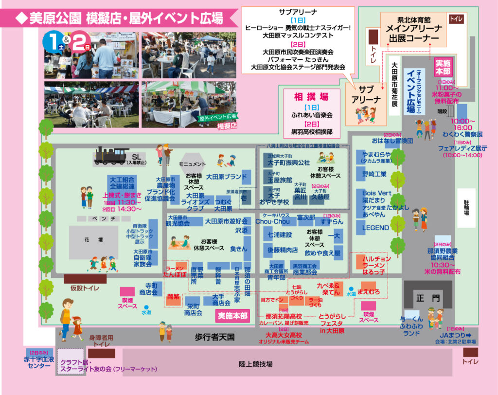 両日ともに屋内外のイベント・飲食店・企業の出展・団体サークルコーナー等々、盛沢山です。